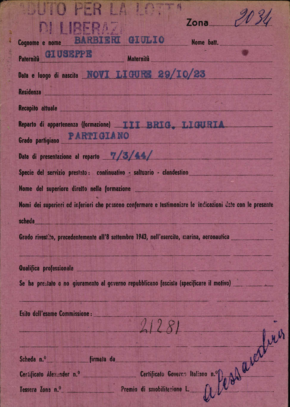 Partigiano della 1°Brigata Giancarlo Odino dal 7 marzo 1944.