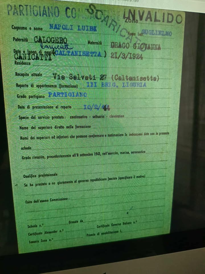 Nato a Canicattì, Agrigento, il 21 marzo 1924, di Calogero, celibe, emigrato a Caltanissetta il 23 ottobre 1935.